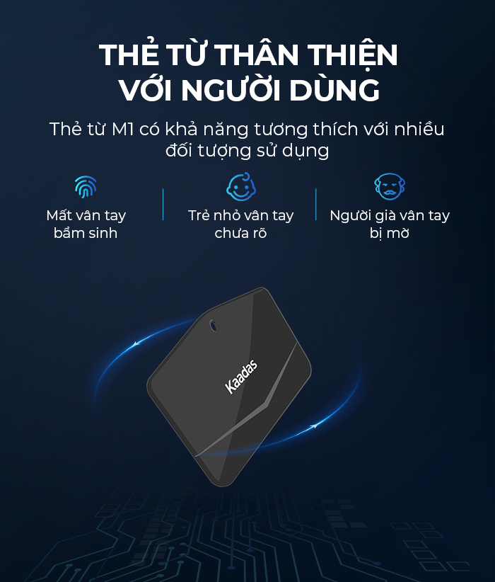 Khoá điện tử Kaadas Q9 FVP đi kèm thẻ từ M1 được thiết kế thân thiện, phù hợp với nhiều đối tượng sử dụng. Đây là giải pháp tối ưu dành cho những ai có dấu vân tay mờ, khó nhận diện như người già, trẻ nhỏ hoặc người mất vân tay bẩm sinh. Việc tích hợp thẻ từ giúp mở rộng thêm lựa chọn ra vào dễ dàng, đồng thời đảm bảo tính bảo mật nhờ công nghệ mã hóa chống sao chép. Đây chính là một trong những ưu điểm vượt trội, mang đến sự tiện lợi cho cả gia đình đa thế hệ.