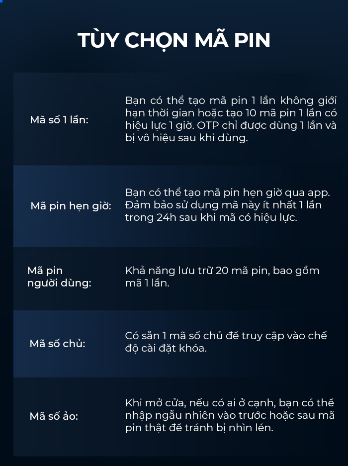 Mã pin hẹn giờ: Thiết lập qua app, chỉ có hiệu lực trong khung giờ nhất định.