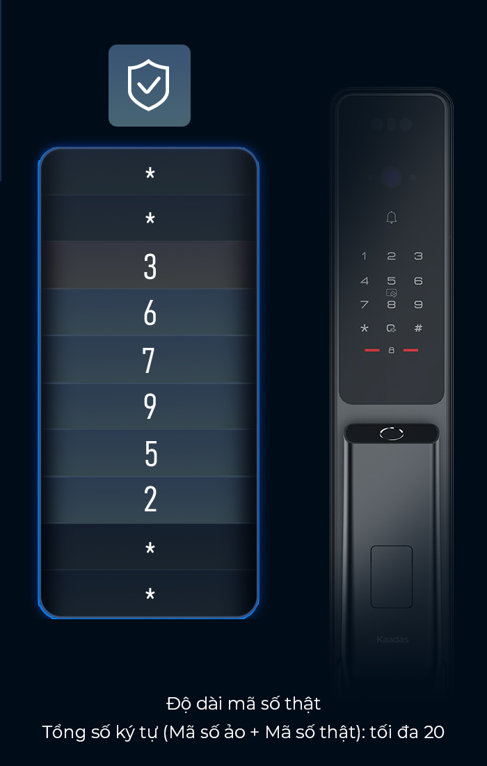 Chức năng nhập mã số ảo giúp người dùng yên tâm khi mở cửa mà không lo bị lộ mật khẩu. Người dùng có thể thêm số ngẫu nhiên trước hoặc sau mật khẩu thật để tránh ánh mắt dòm ngó.